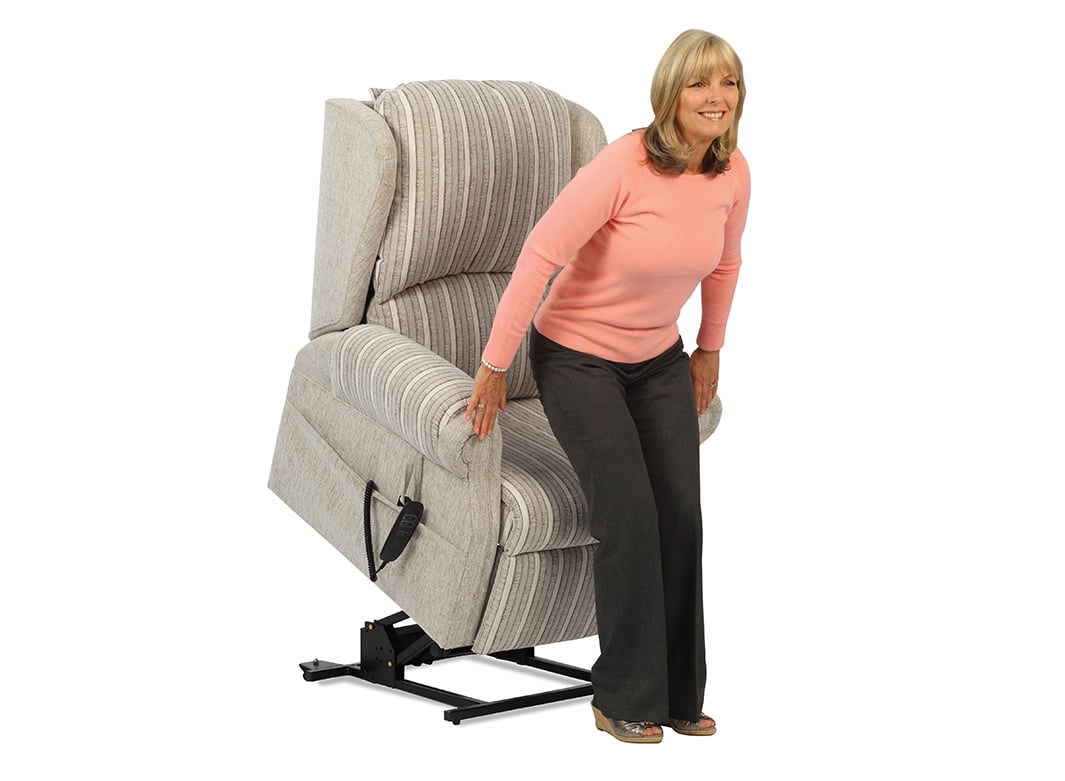 Shown here with our cushion back, the Hampshire Collection of rise & recliner chairs and adjustable sofa has an added layer of padding on the arm for that extra comfort. The construction of the arm has been adjusted so this does not affect its original height. This recliner chair and sofa with extra padding is a very popular choice for those spending a lot of time in their seat.